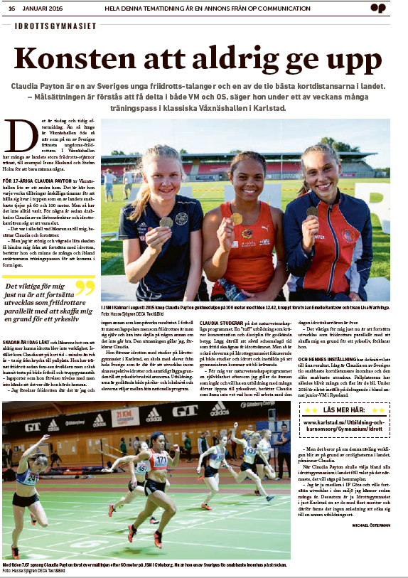 Till sist ska vi visa en artikel ur tidningen ”Det smarta skolvalet” som fanns med som bilaga i Aftonbladet under januari. Här berättar föreningens unga sprinter Claudia Payton om hur det är att gå på Friidrottsgymnasiet i Karlstad och om hur man kombinerar friidrott och studier på gymnasienivå. Det fina med Karlstad är att man sedan kan studera vidare på Elitidrottsuniversitet och behålla samma kontinuitet på träningen samtidigt som man vidareutbildar sig.