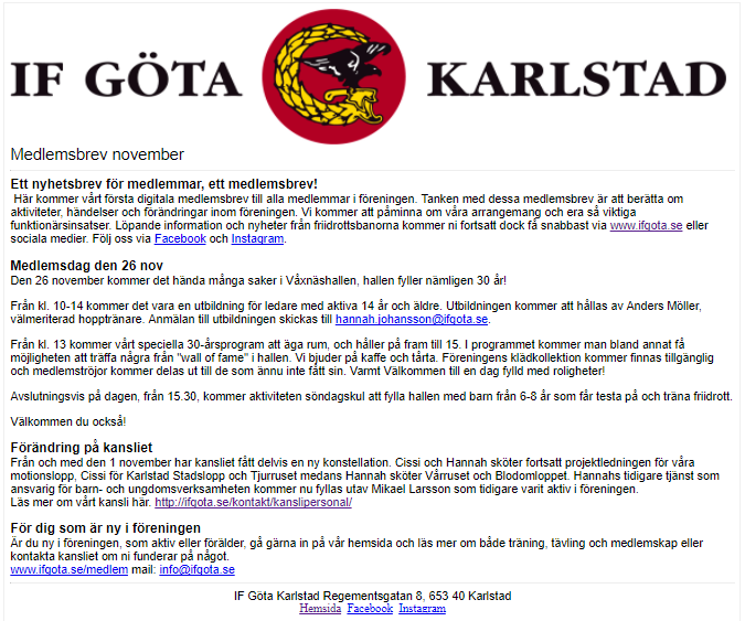 Under förra veckan skickade vi ut vårt första digitala nyhetsbrev till våra medlemmar. I detta nyhetsbrev kommer kansliet att informera om vad som är på gång i föreningen, viktiga datum att hålla reda på, förändringar som sker i vår organisationen och mycket, mycket mer!