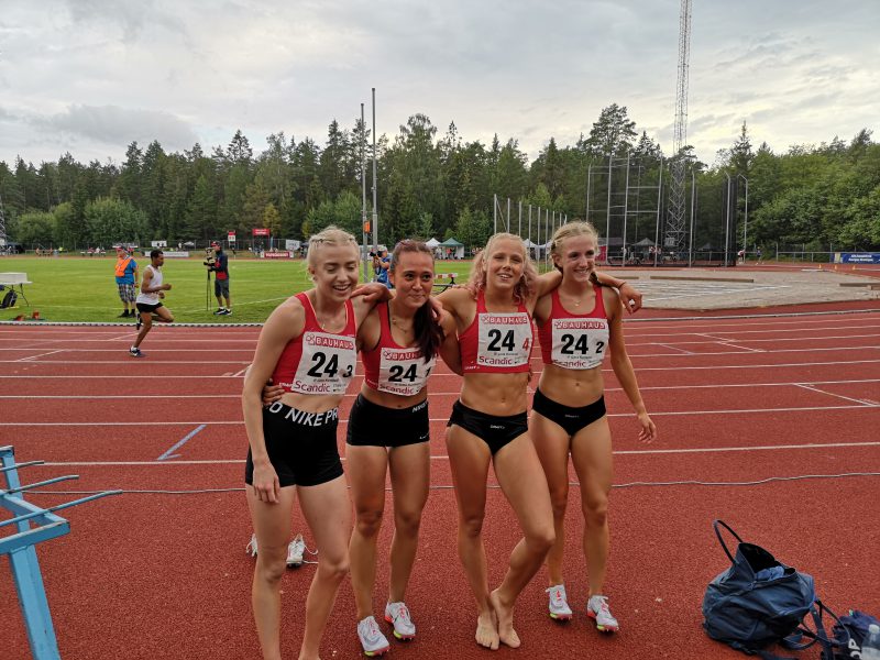 Lovisa Ellström, Lova Perman, Hanna Karlsson och Minna Svärd representerade laget på K 4×400 m. Jämfört med den dubbla distansen visste tjejerna på förhand att de hade en god medaljchans. Och ja, kalkyleringen visade sig vara rätt. Lovisa sprang på hennes yttersta förmåga och lämnade över pinnen till Lova med några meter upp till starka Ullevi. Lova jagade ikapp och kunde jämsides växla över till till Hanna på tredje sträckan, en sträcka där Hannas split-tid visade sig vara hela 1,5 s snabbare än hennes pers. Ullevilöperskan Lisa Lilja kunde gå om och växla som ledare tätt följd av IF Göta. Stafettpinnen kunde efter Hannas fenomenala sträcka tillslut landa i Minnas hand. Minna som kunde göra ett starkt lopp och hålla andraplatsen ända in i mål. Silvertiden noterades till 3:40,42 och är ca en sekund från klubbrekord. Grattis till silver tjejer!