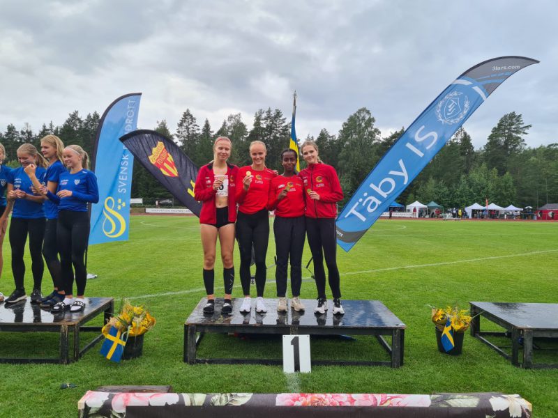 Göta ställde i svensk stafett f 17 upp med fyra tjejer födda -05, Vendela Stridsberg, Irma Jonhed, Lathifa Afrah och Ella Holmqvist. Otroligt duktiga tjejer som stod för en häftig prestation i en jämn final som de till slut kunde gå segrande ur. Den finfina segrartiden 2:19,88 var endas 0,72 s snabbare än tvåan IFK Växjö. Stort grattis till ett välförtjänt guld!